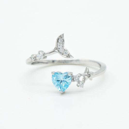 925 Sterling Silver Blue CZ Whale Tail Heart Adjustable Bypass Ring
