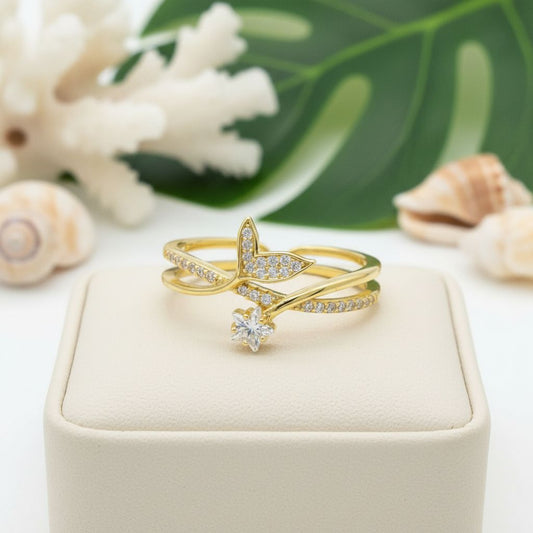 925 Sterling Silver CZ Whale Tail Adjustable Gold Plated Ring