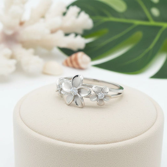 925 Sterling Silver Three Hawaiian Plumeria Flowers CZ Band Ring