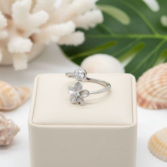 925 Sterling Silver 10mm Plumeria Flower CZ Adjustable Spinner Ring