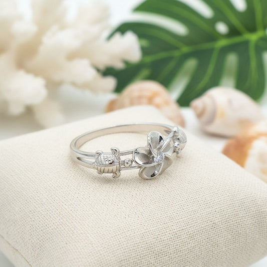 925 Sterling Silver 10mm Hawaiian Plumeria Flower CZ Sea Turtle Ring