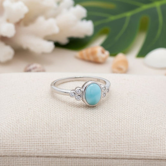 Oval Larimar Stone Bezel Cabochon Ring with CZ Accents - 925 Sterling Silver