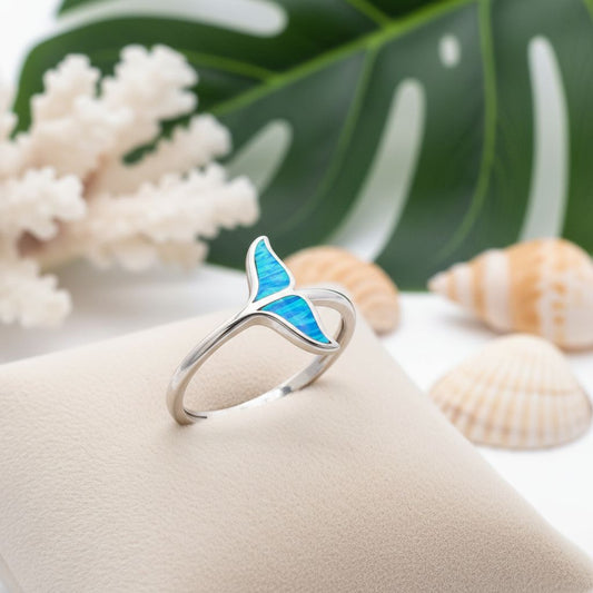 925 Sterling Silver Blue Opal Stone Hawaiian Whale Tail Band Ring