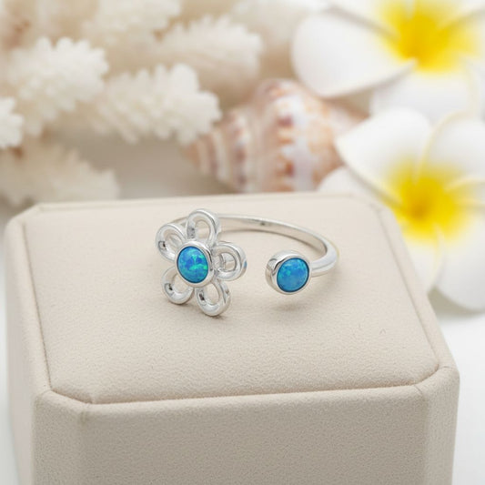 925 Sterling Silver Blue Opal Stone Flower Adjustable Fidget Spinner Ring