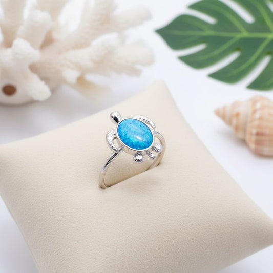 925 Sterling Silver Blue Opal Stone Round Hawaiian Sea Turtle Ring