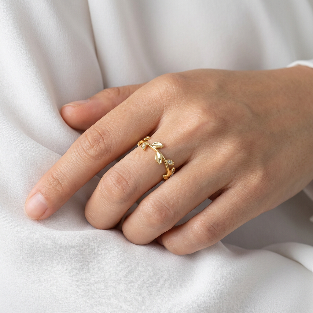 925 Sterling Silver Hawaiian Maile Leaves CZ Adjustable Gold Plated Band Ring