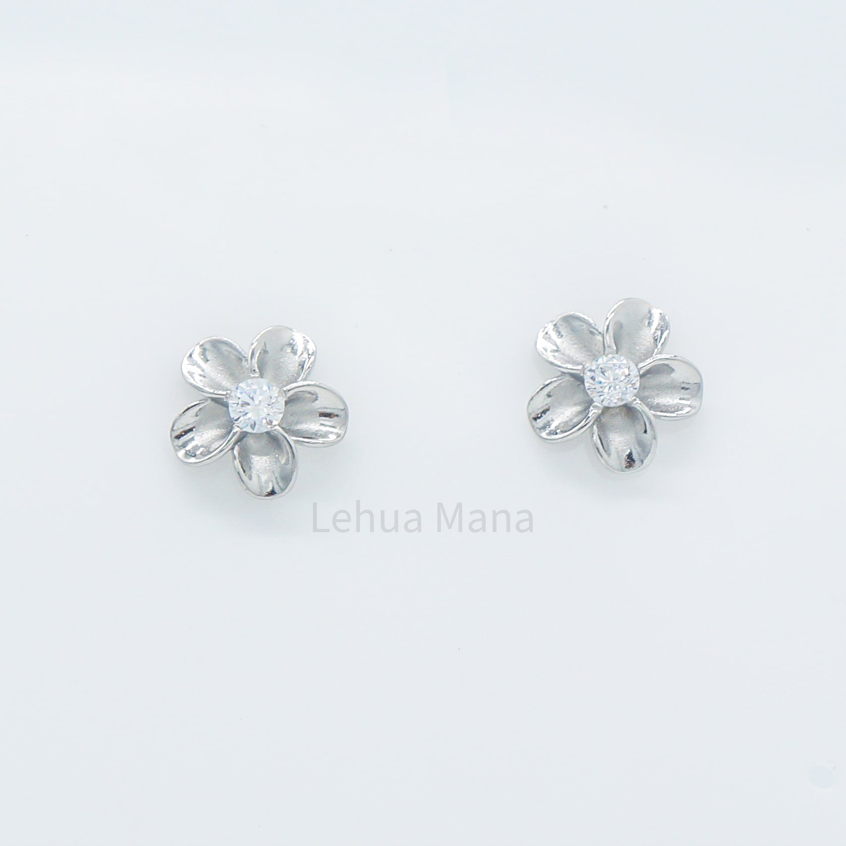 925 Sterling Silver Plumeria Flower Stud Earrings (with Cubic Zirconia)