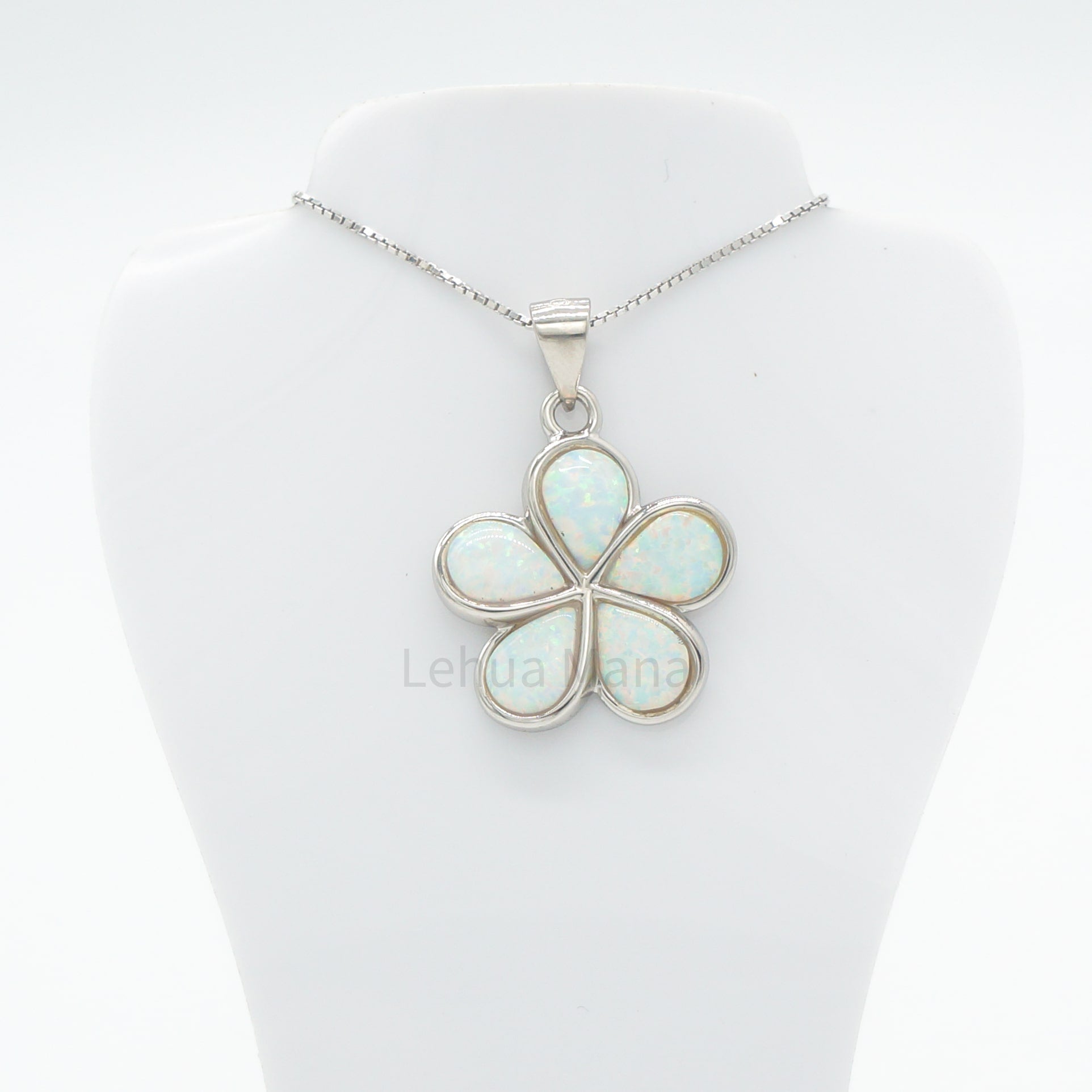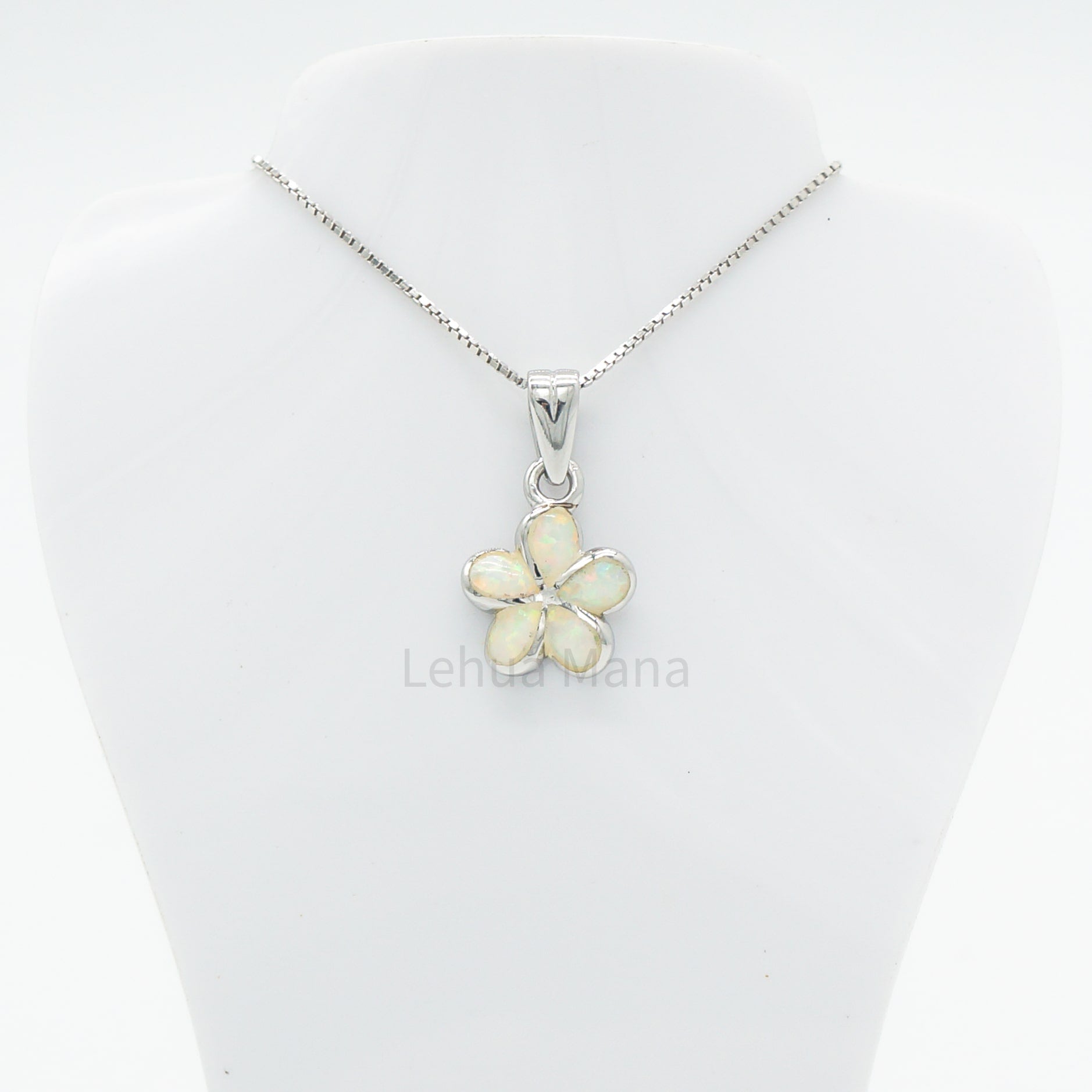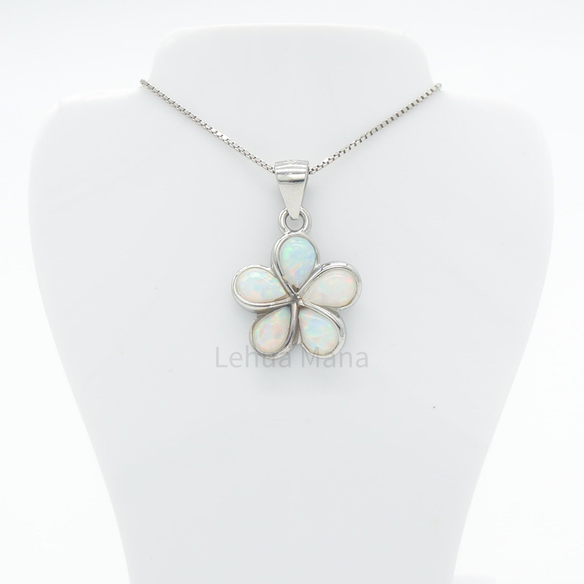 925 Sterling Silver White Opal Hawaiian Plumeria Flower Pendant Necklace