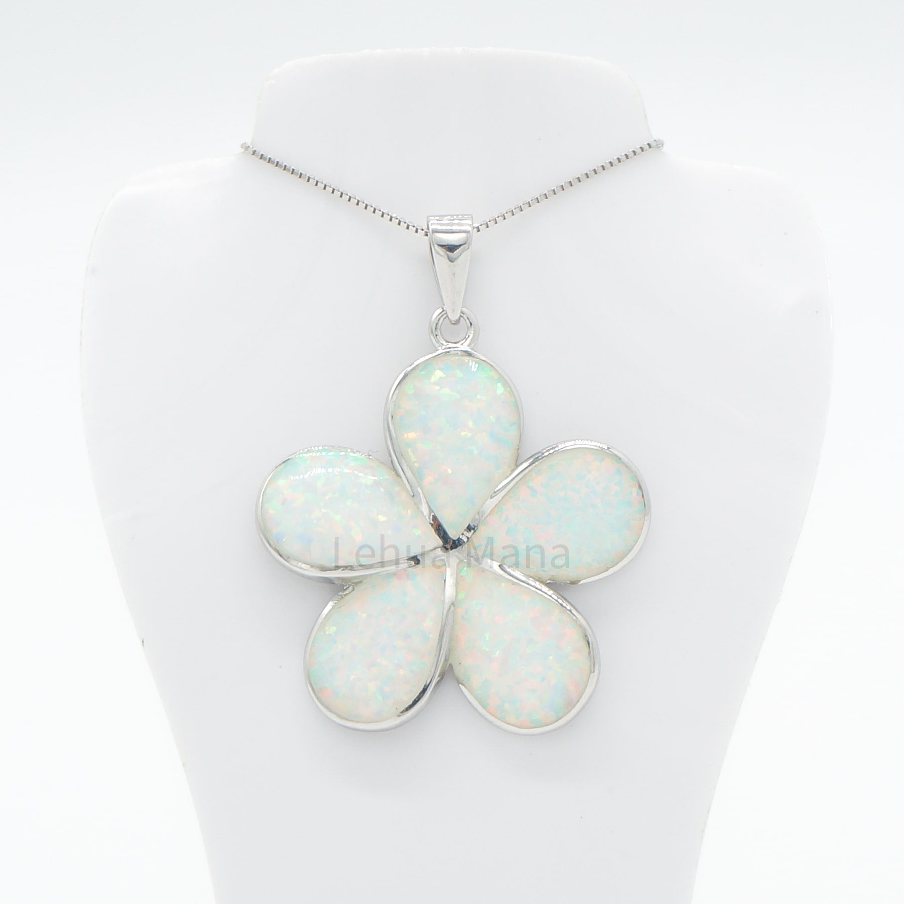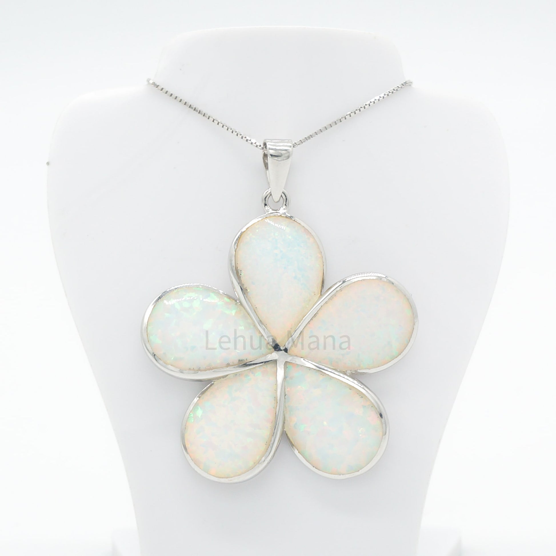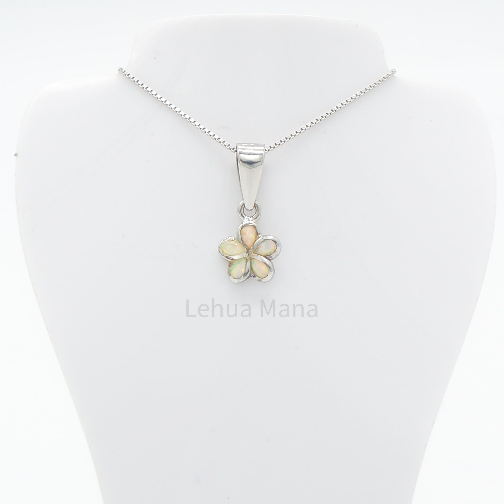 925 Sterling Silver White Opal Hawaiian Plumeria Flower Pendant Necklace